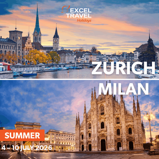 Summer escape to Zurich & Milan, 4–10 July 2026. 6 nights, flights, breakfast & transfers included. From EGP 68,680 per person.