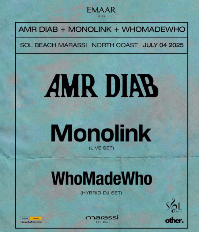 Amr Diab, Monolink & WhoMadeWho live at Sol Beach North Coast. Beach vibes, iconic hits & cutting-edge sounds!